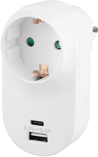 A fehér hálózati adapter az európai kereskedelemben kapható védőérintkezős dugaszoló aljzatokhoz való csatlakoztatásra alkalmas. Védőérintkezős csatlakozóaljzattal és két 2,1 A-es USB porttal rendelkezik, melyek kiválóan alkalmasak okostelefonok és táblagépek töltéséhez. A csatlakozóaljzat kizárólag beltéri használatra alkalmas. Kibővített érintésvédelemmel is rendelkezik. A csatlakozóaljzat maximális névleges feszültsége 230 V / 10 A, névleges teljesítménye maximum 3500 W. A hálózati adapter előnye a 3 az 1-ben funkció. Az USB portok segítségével egyszerre 2 készüléket tölthet, és egyidejűleg a csatlakozóaljzatot is használhatja.