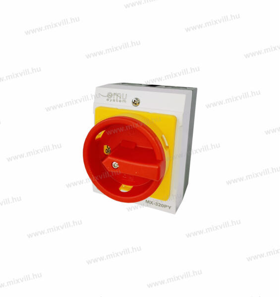 OMU system MX-320PY 3 pólusú 20A IP65 tokozott tűzvédelmi kapcsoló lakatolható Kikapcsolt állapotban 3 lakattal lakatolható.