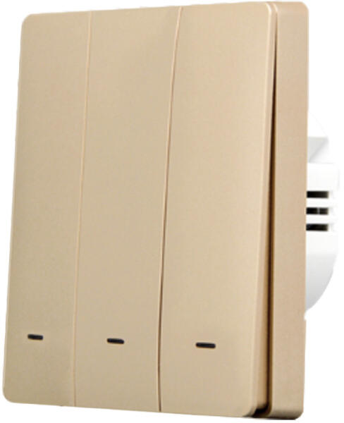 A SmartWise B6-UNI Zigbee okos villanykapcsoló termékcsalád kompatibilis az eWeLink Zigbee átjárókkal és más Zigbee 3.0 rendszerekkel is, szabványos Zigbee 3.0 chip-el + RF 433MHz vevőegységgel is felszerelt okoskapcsolókat kínál, fizikai nyomógombos kivitelben. Univerzális termékverzió: fázis és nullavezetékkel, VAGY csak fázisvezetékkel is beköthető. Ez a 3 áramkörös verzió, arany színű, fizikai nyomógombos előlappal.